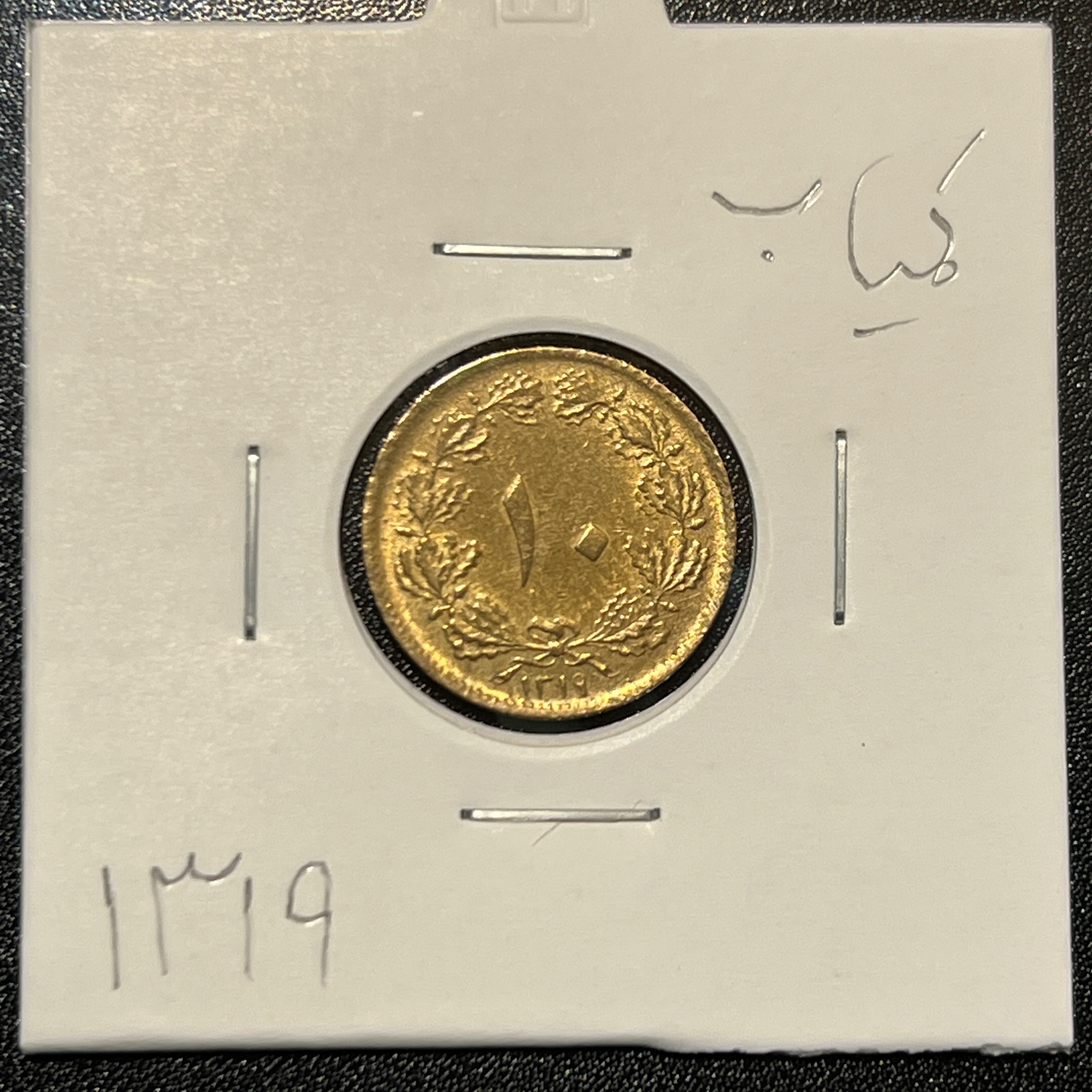 📜 مشخصات فنی و تاریخی این سکه ۱۰ دیناری از جنس برنج، یکی از قطعات پولی رایج دوره پهلوی اول است که در سال ۱۳۱۹ ضرب شده است. این نمونه با اصالت ضرب یک، یک گزینه ارزشمند برای مجموعهداران سکههای پهلوی به شمار میرود.