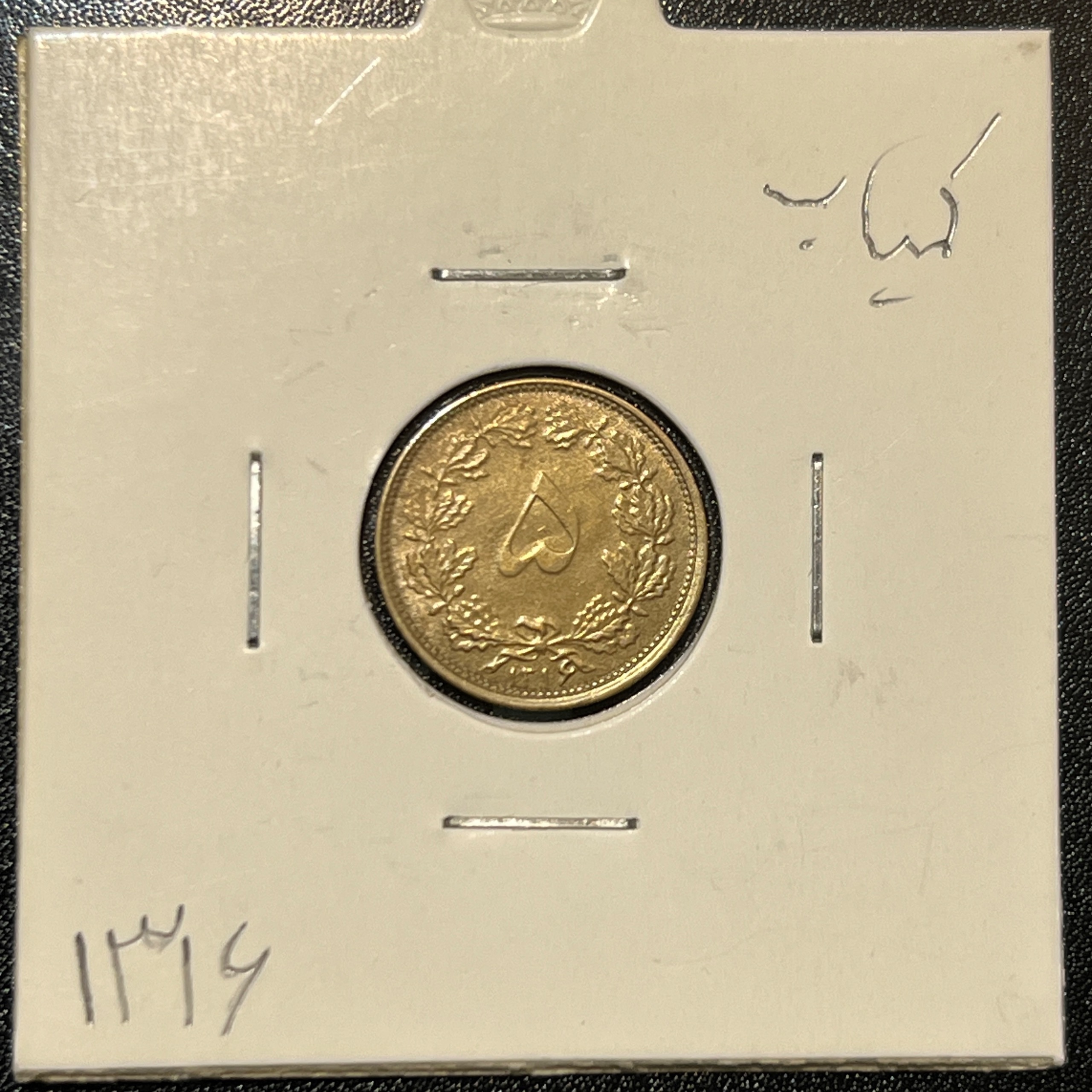 📜 مشخصات تاریخی این سکه ۵ دیناری از جنس برنج، مربوط به دوره پهلوی اول و سال ۱۳۱۶ است. این قطعه به دلیل قدمت و کیفیت مطلوب خود، بخش مهمی از مجموعه سکههای عصر پهلوی را تشکیل میدهد.
