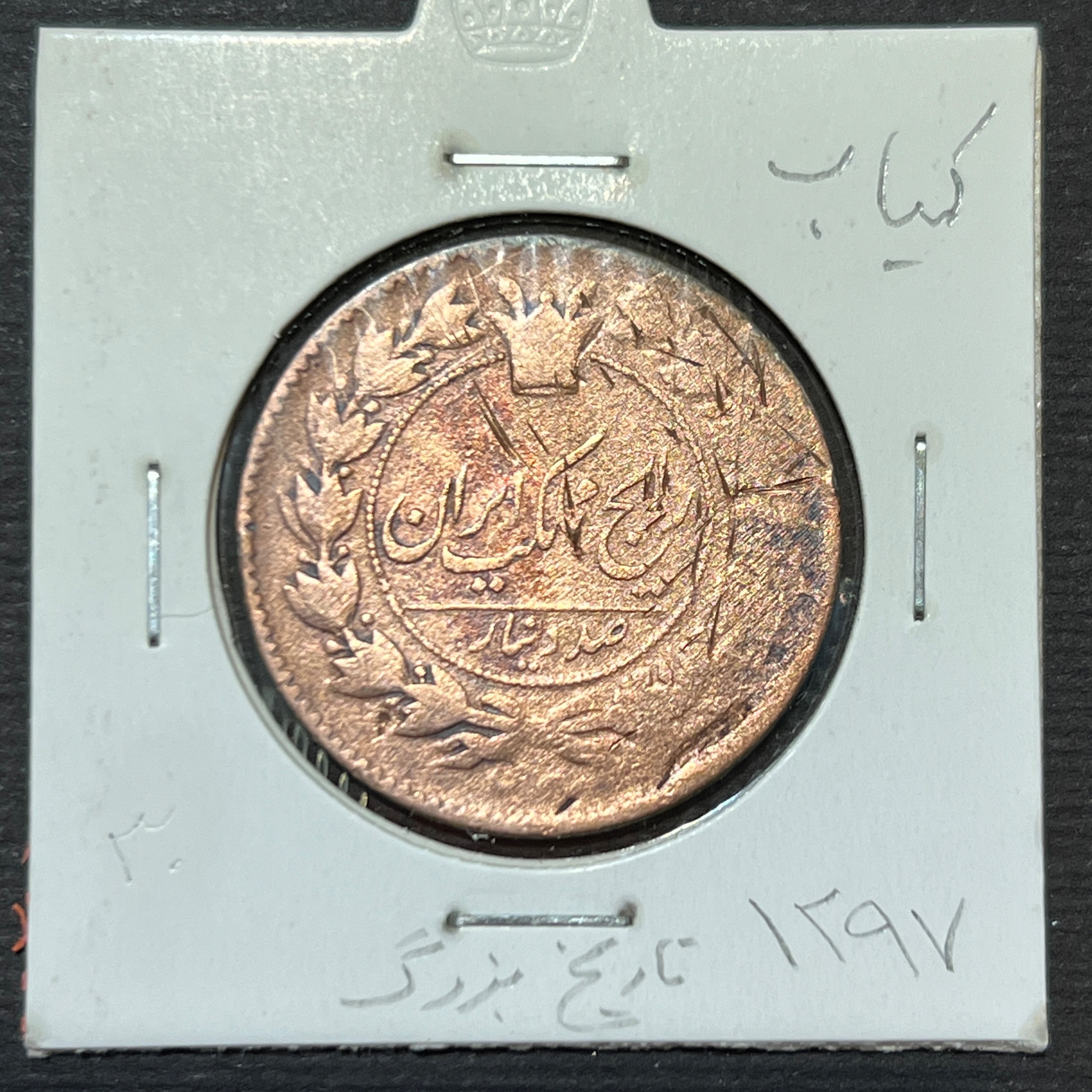 سکه خیلی کمیاب صد دینار مسی از دوره ناصرالدین شاه قاجار. این سکه با تاریخ ۱۲۹۷ قمری عرضه شده و یک آیتم کلکسیونی بسیار کمیاب برای مجموعه‌داران سکه‌های قاجاری محسوب می‌شود.