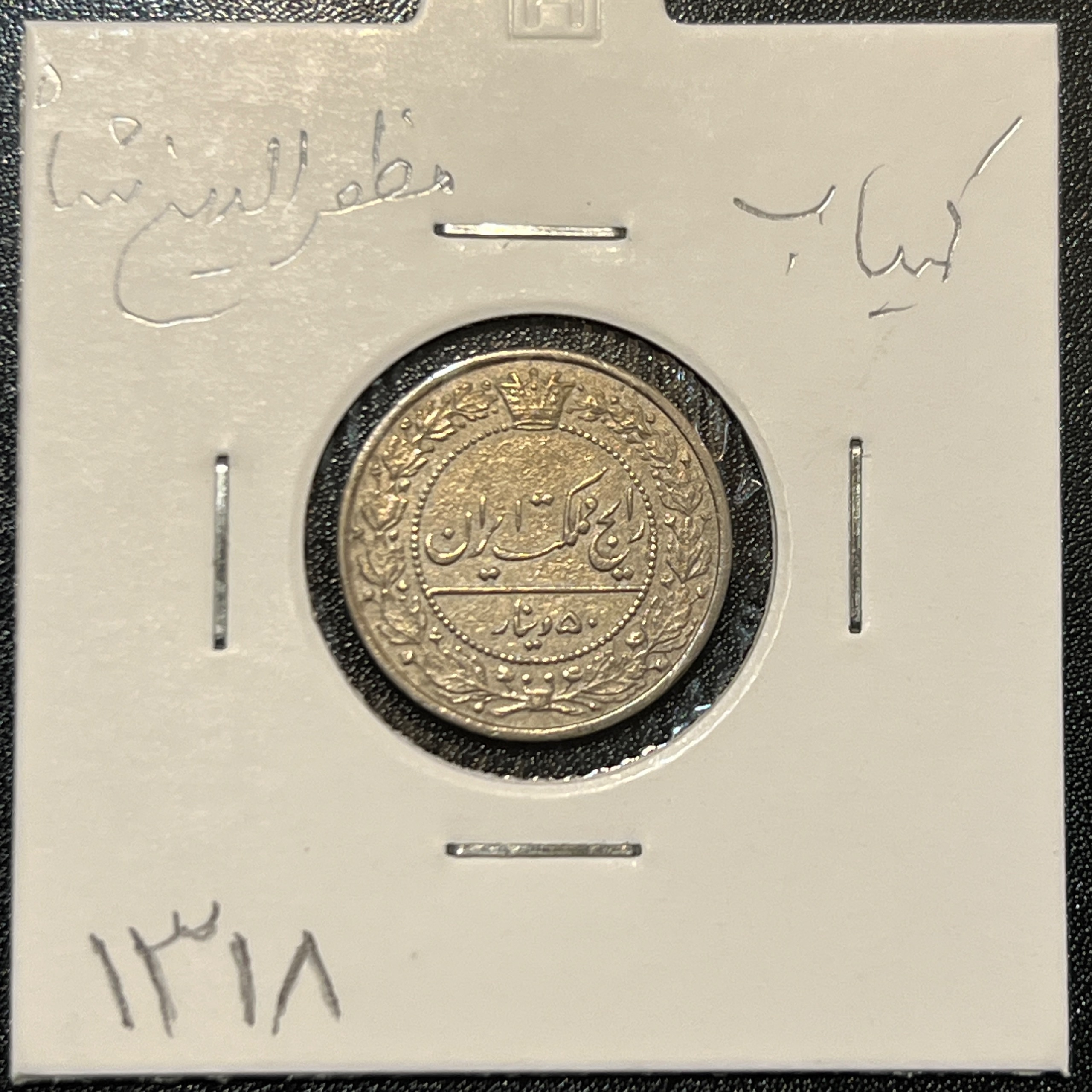 سکه رایج ۵۰ دینار از جنس نیکل و دوره مظفرالدین شاه قاجار، ضرب سال ۱۳۱۸ قمری. این سکه دارای عبارت “رایج مملکت ایران” بوده و با کیفیت بسیار عالی عرضه شده است.