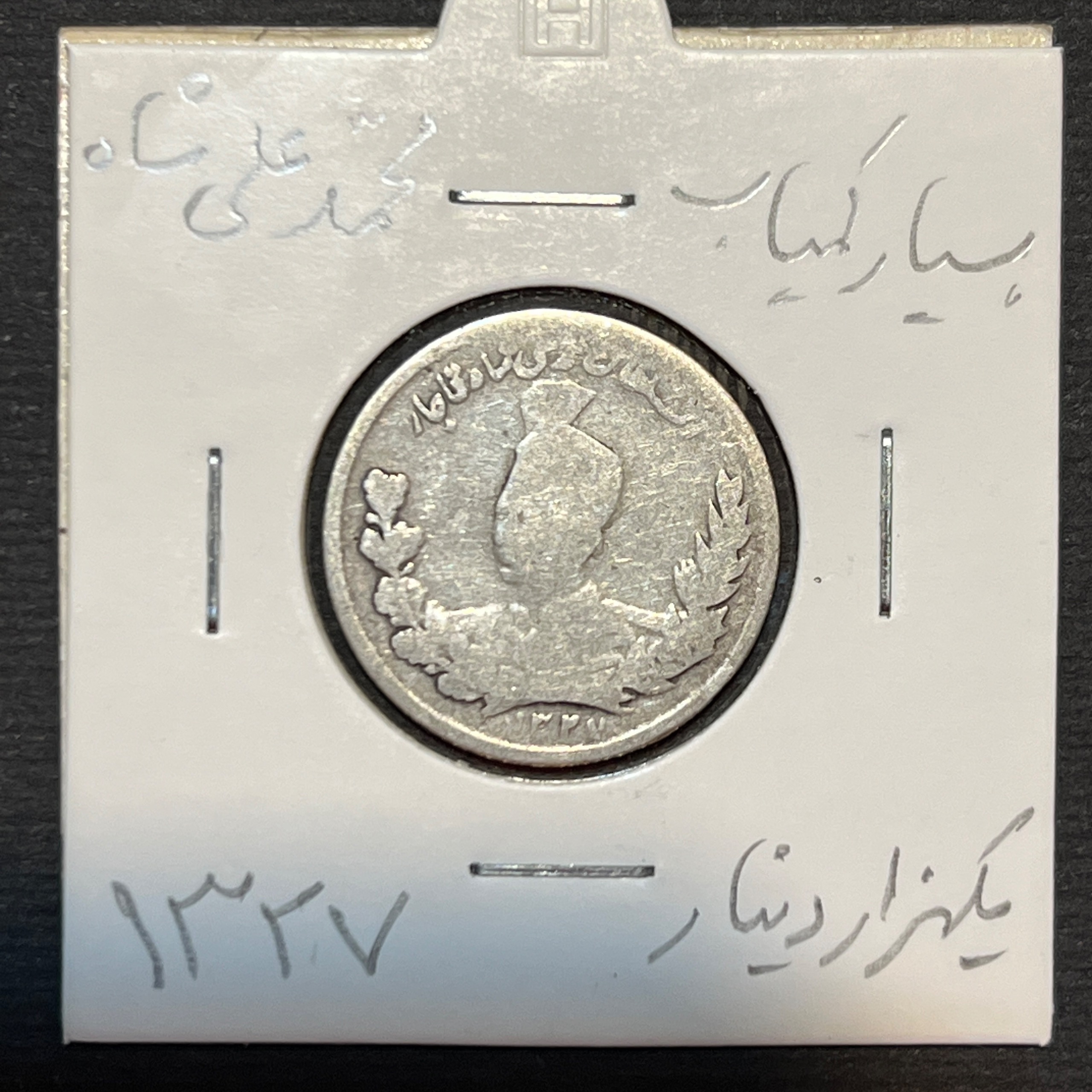 سکه ۱۰۰۰ دینار نقره محمد علی شاه قاجار، ضرب سال ۱۳۲۷ قمری. این سکه بسیار کمیاب و سندی از آخرین سال‌های قاجار است. تضمین اصالت مادام‌العمر توسط گنجینه پول ایران.