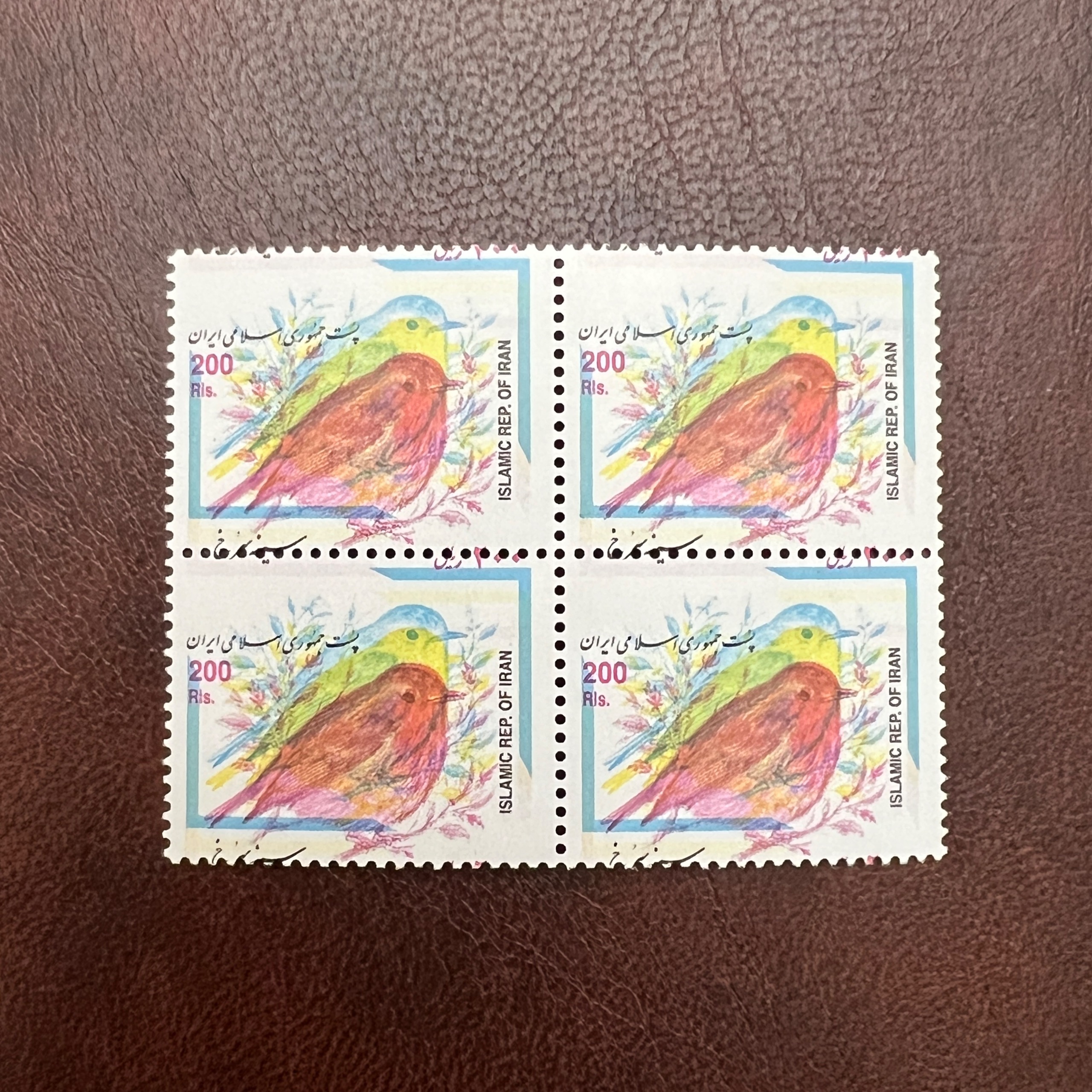 بلوک تمبر پستی پرندگان از سال ۱۳۸۰ و دوره جمهوری اسلامی ایران. این تمبر به عنوان یک نمونه کلکسیونی ارزشمند با ویژگی اشتباه چاپی، ارور رنگ، یا دندانه عرضه شده و با وضعیت نو و مهرنخورده می‌باشد. فقط ۱ عدد از این ارور کمیاب موجود است.